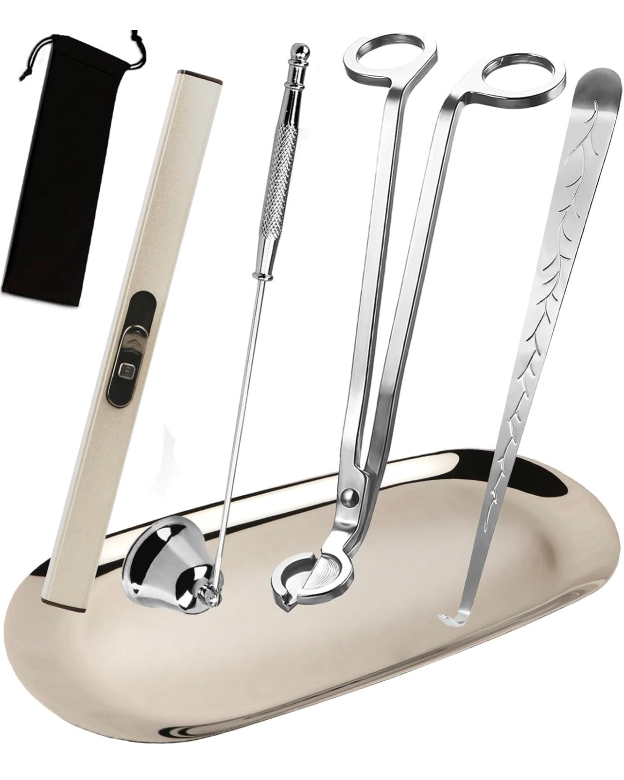 5 in 1 Candle Accessory Set, Candle Wick Trimmer Cutter, Candle Snuffer & Candle Wick Dipper,USB Rechargeable Lighter, Storage Tray Plate for Candle Lover Mom Gift, Candle Care Kit