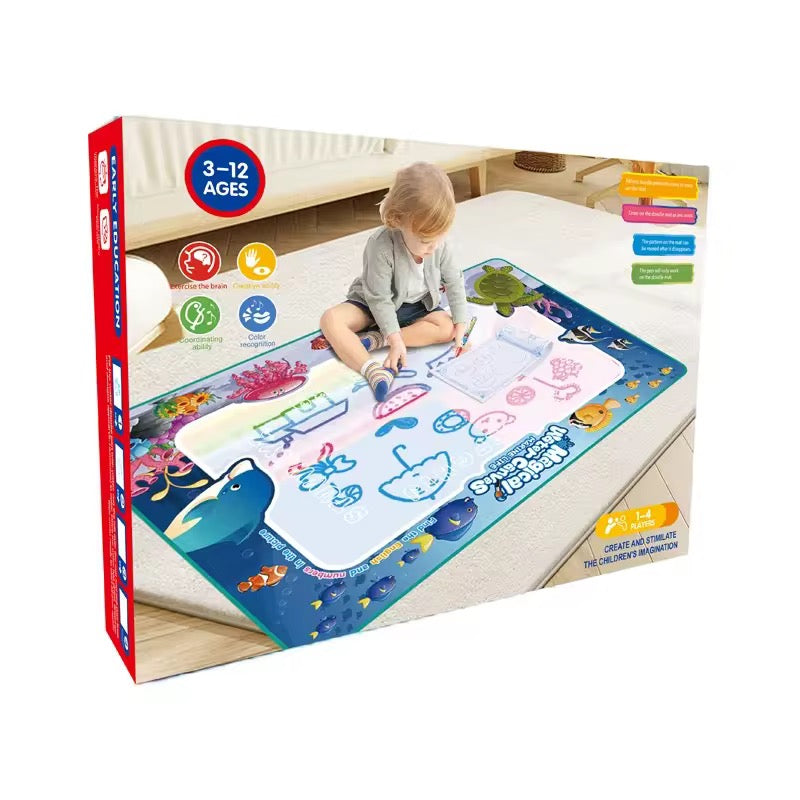 The Magical Water Canvas Drawing Mat allows kids to create colorful artwork using only water. The special fabric reveals vibrant patterns when wet and slowly fades as it dries, making it fully reusable and mess-free. This eco-friendly drawing mat helps develop creativity, motor skills, and imagination without the need for ink, paint, or markers. Safe, clean, and perfect for indoor play, travel, or quiet creative time at home.